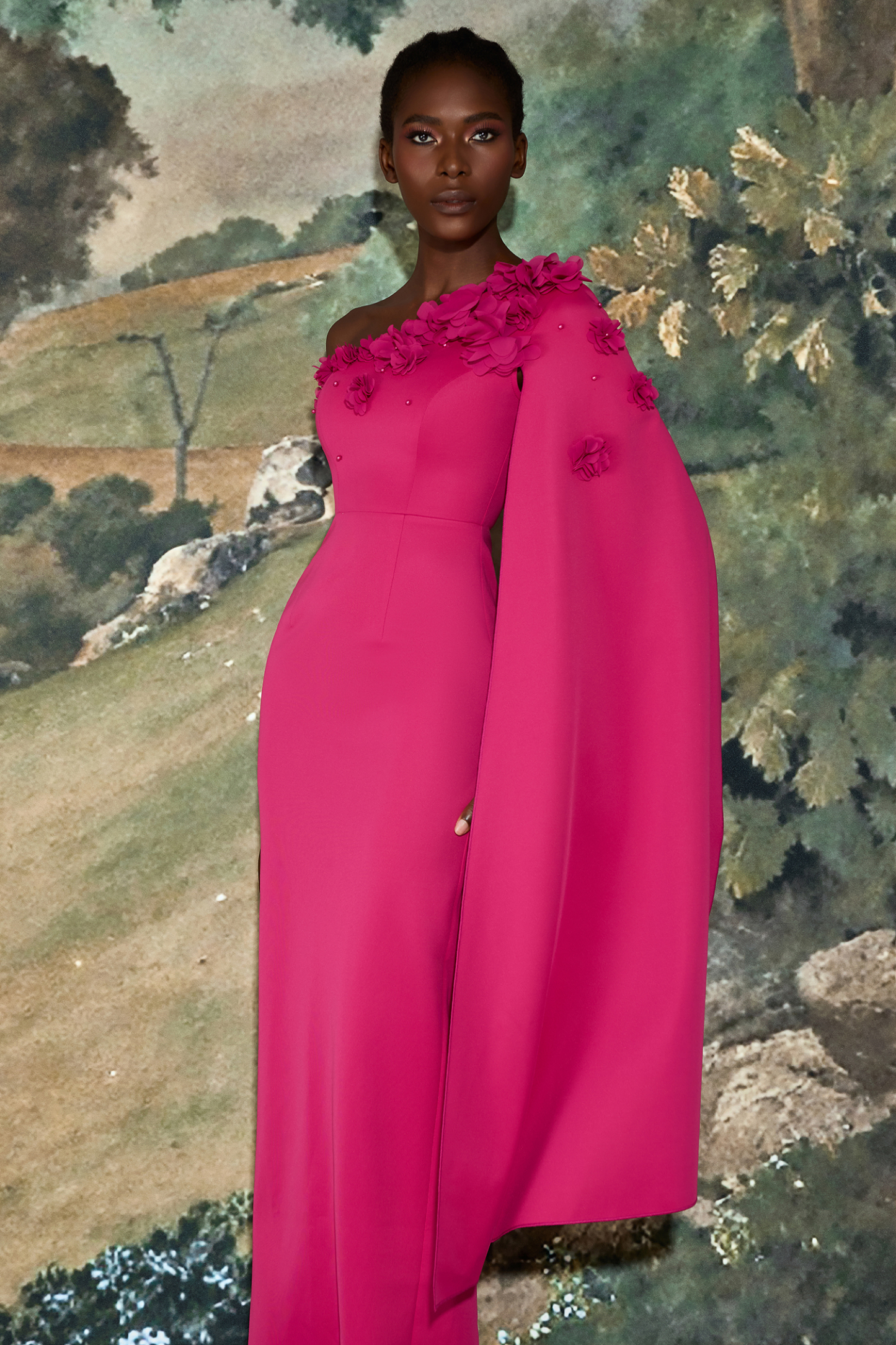 - Sleeveless, solid color, fuchsia, one-shoulder, midi dress