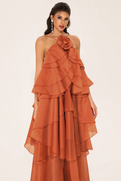- Sleeveless, 3D flower, solid color, orange, halter neck, frill, maxi dress