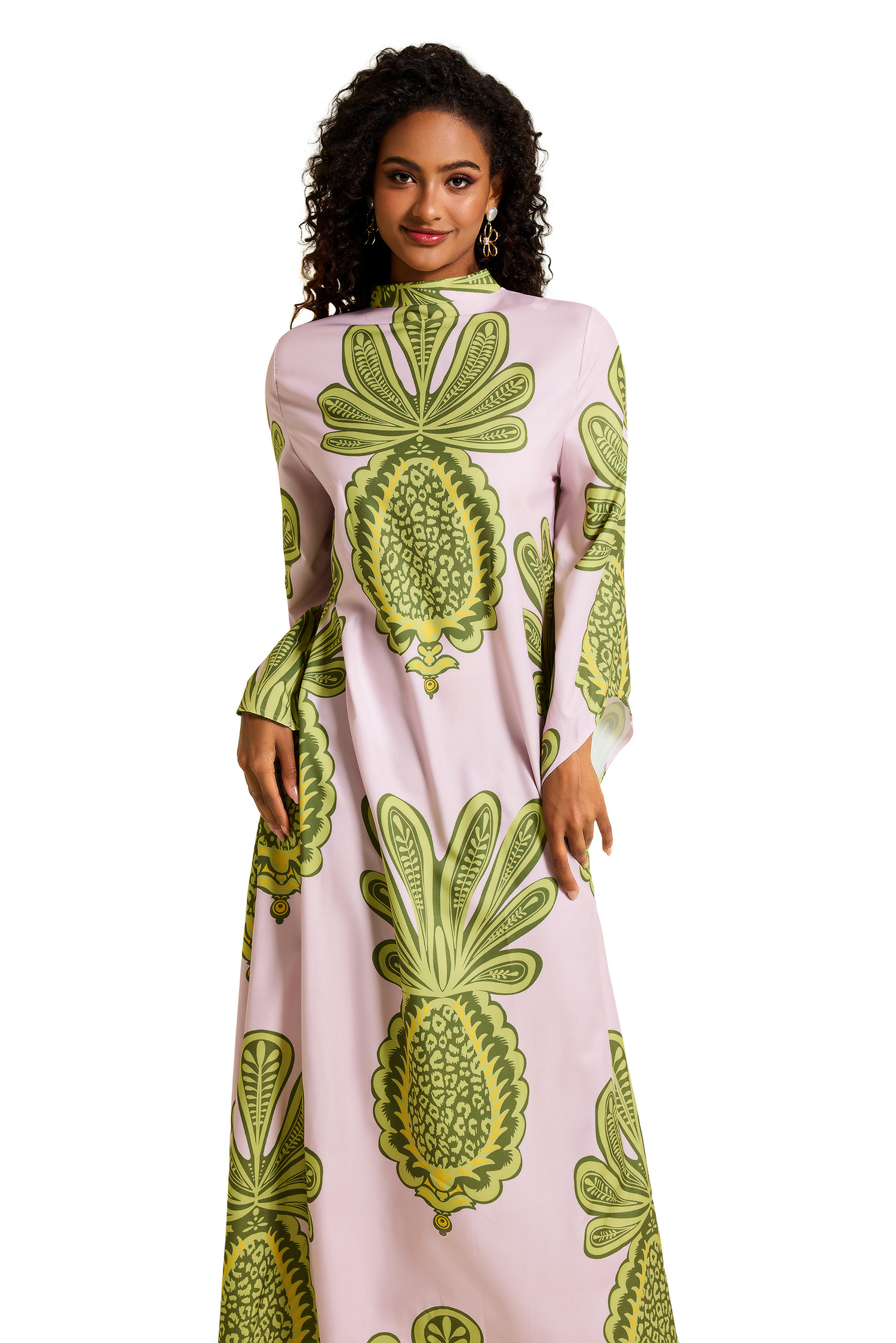 - Botanical print, satin, lace up, maxi dress, green, long sleeve