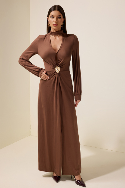 • Long sleeve, solid color, brown, metal, lantern sleeve, maxi dress