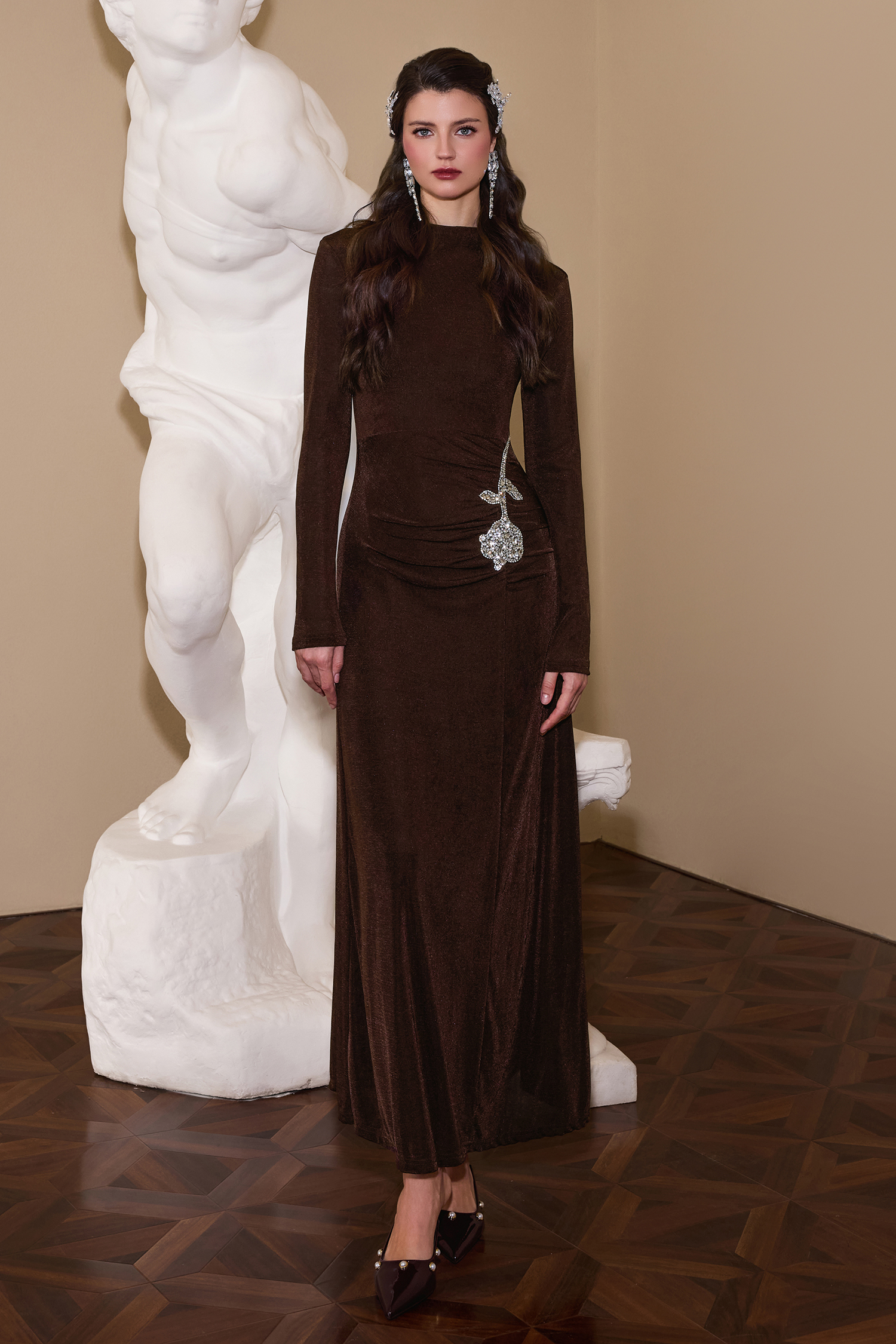 - Long sleeve, solid color, brown, rhinestone, maxi dress