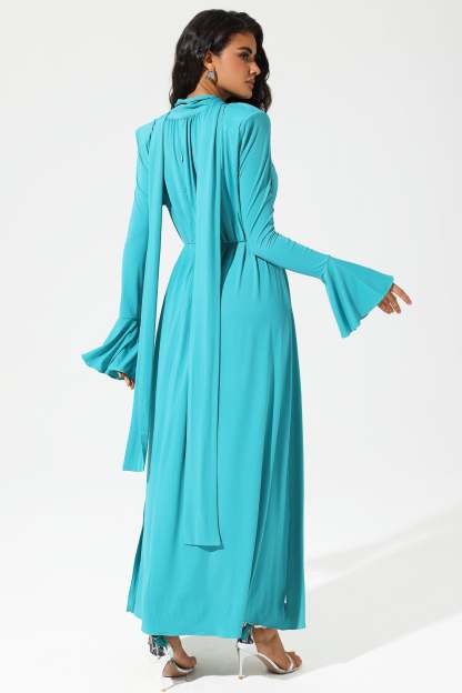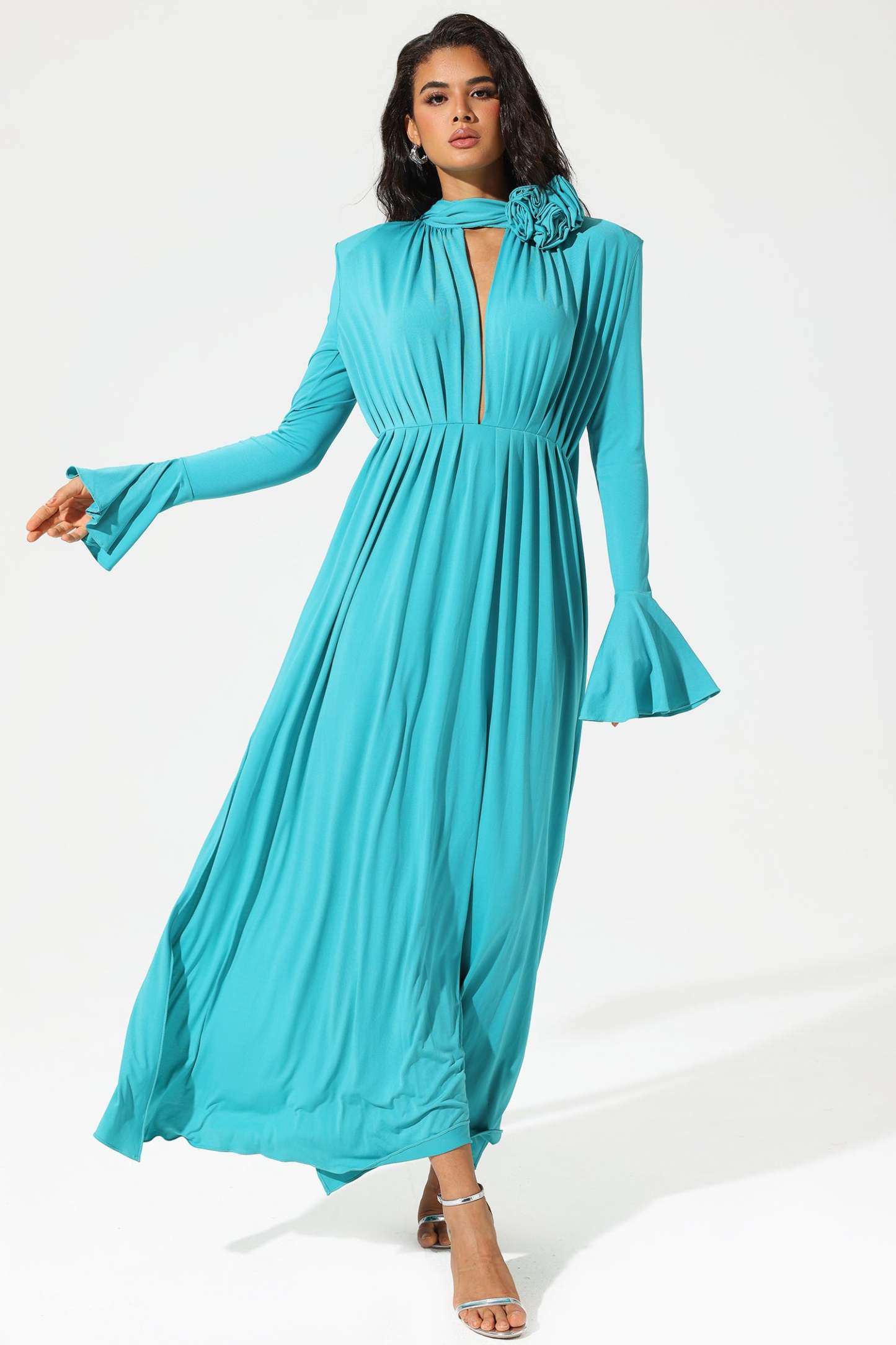 • Lantern sleeve, high collar, flower, slit, midi dress