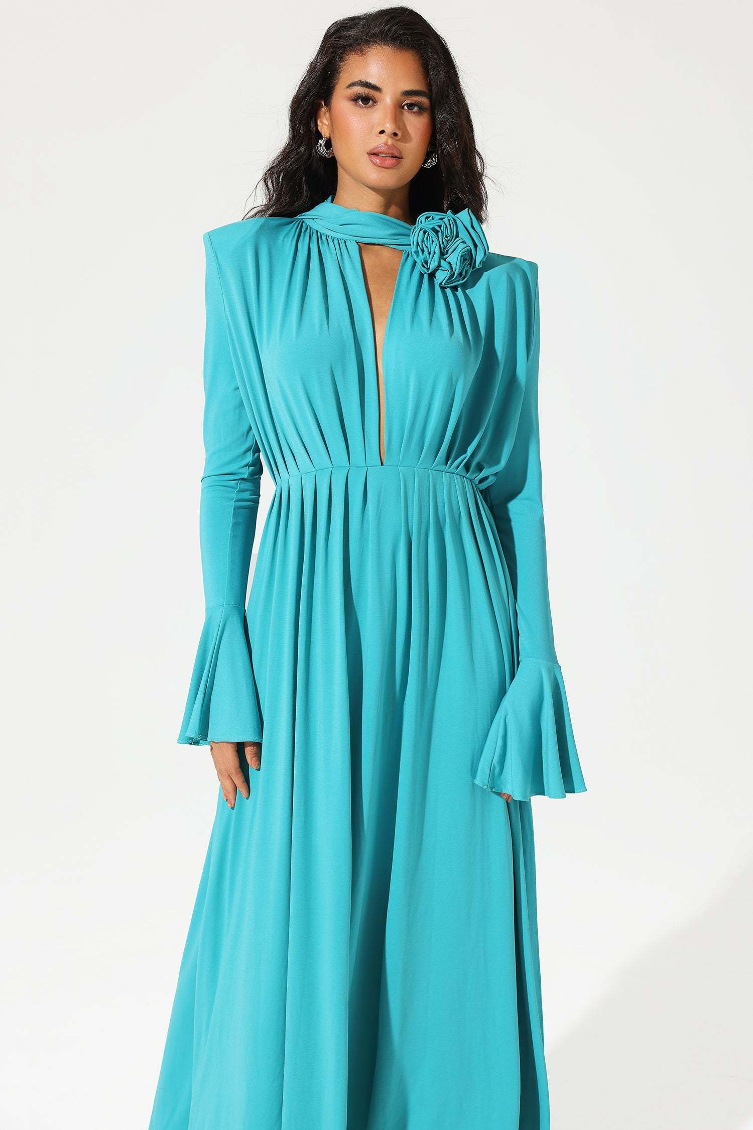 Lorraine High Collar Flower Midi Dress Blue in Blue
