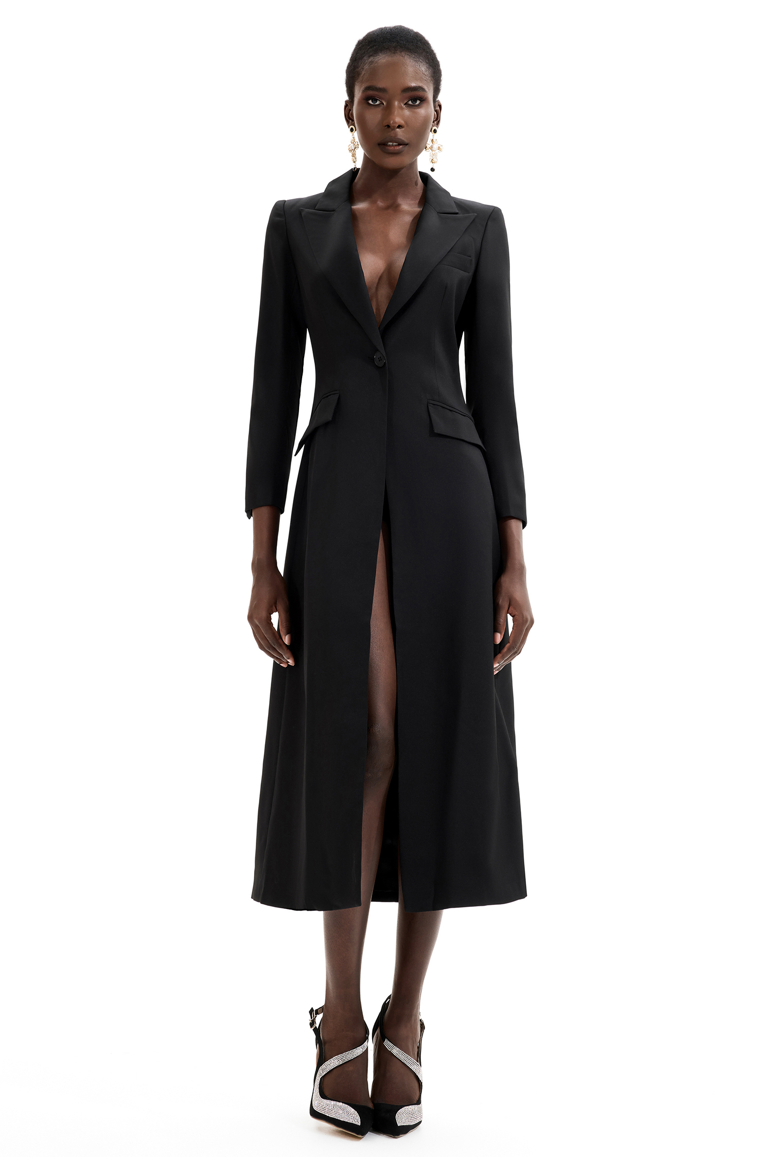 • One-button, polyester, long sleeve, solid black, lounge coat