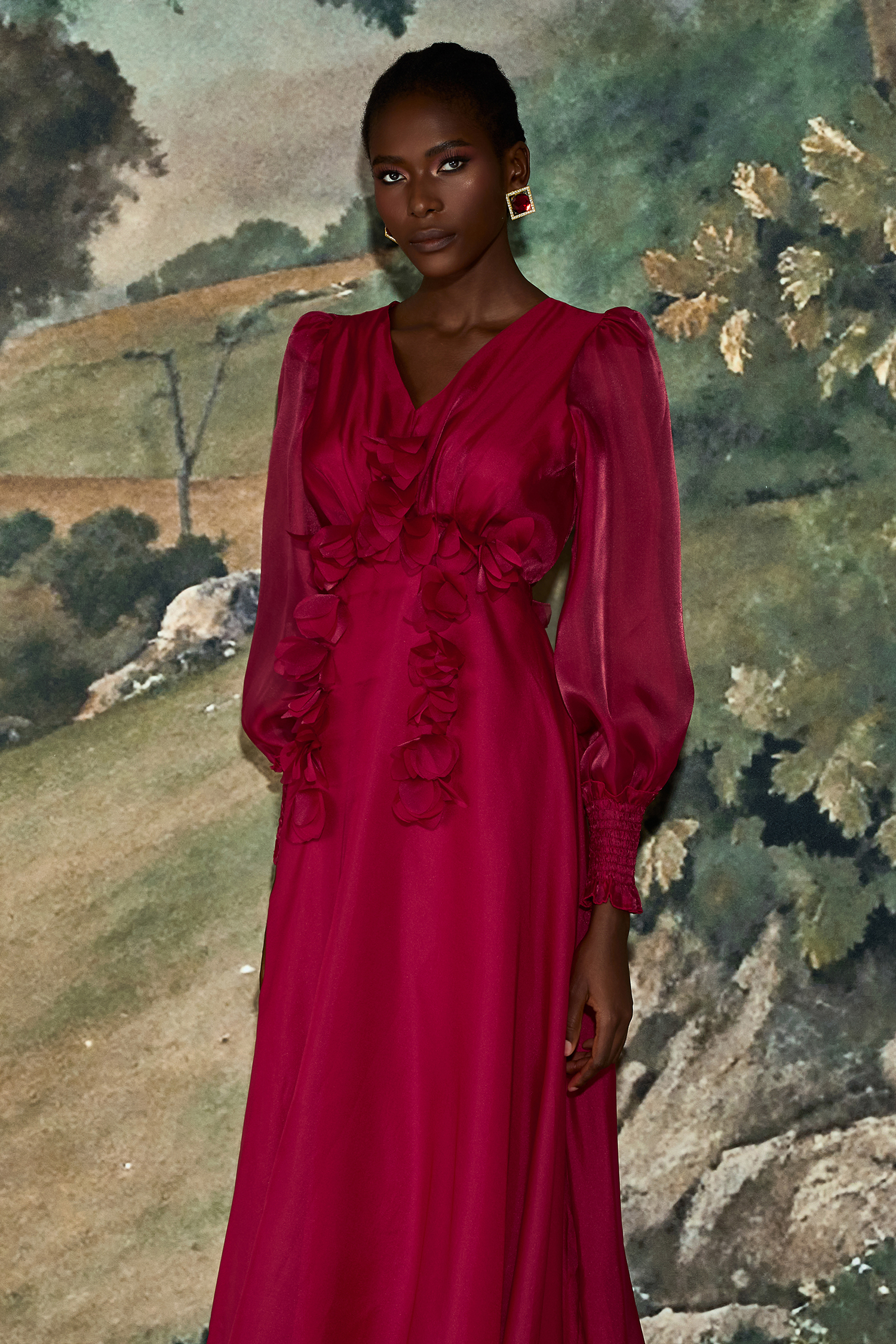 • Solid color, red, 3D flower, long sleeve, maxi dress