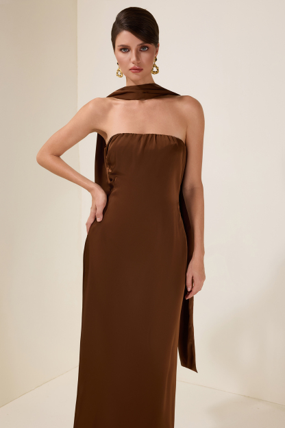 - Sleeveless, off-shoulder, bow, solid color, coffee, midi dress