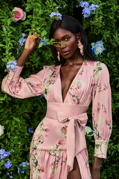 • Long sleeve, floral print, v-neck, satin, lantern sleeve, pink, high split, maxi dress
