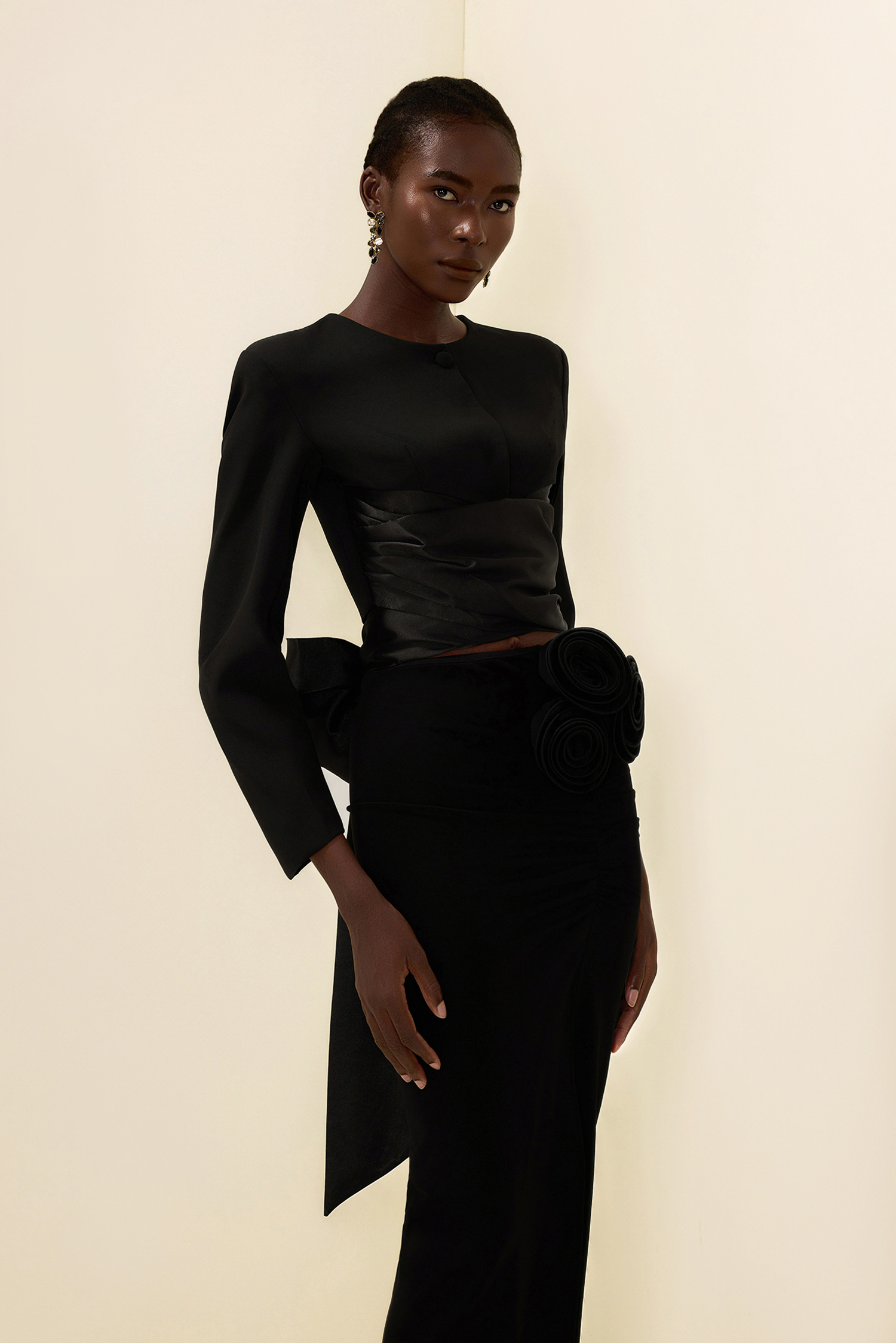 Victoire Lace Up Top & 3D Flower Midi Skirt Set in Black
