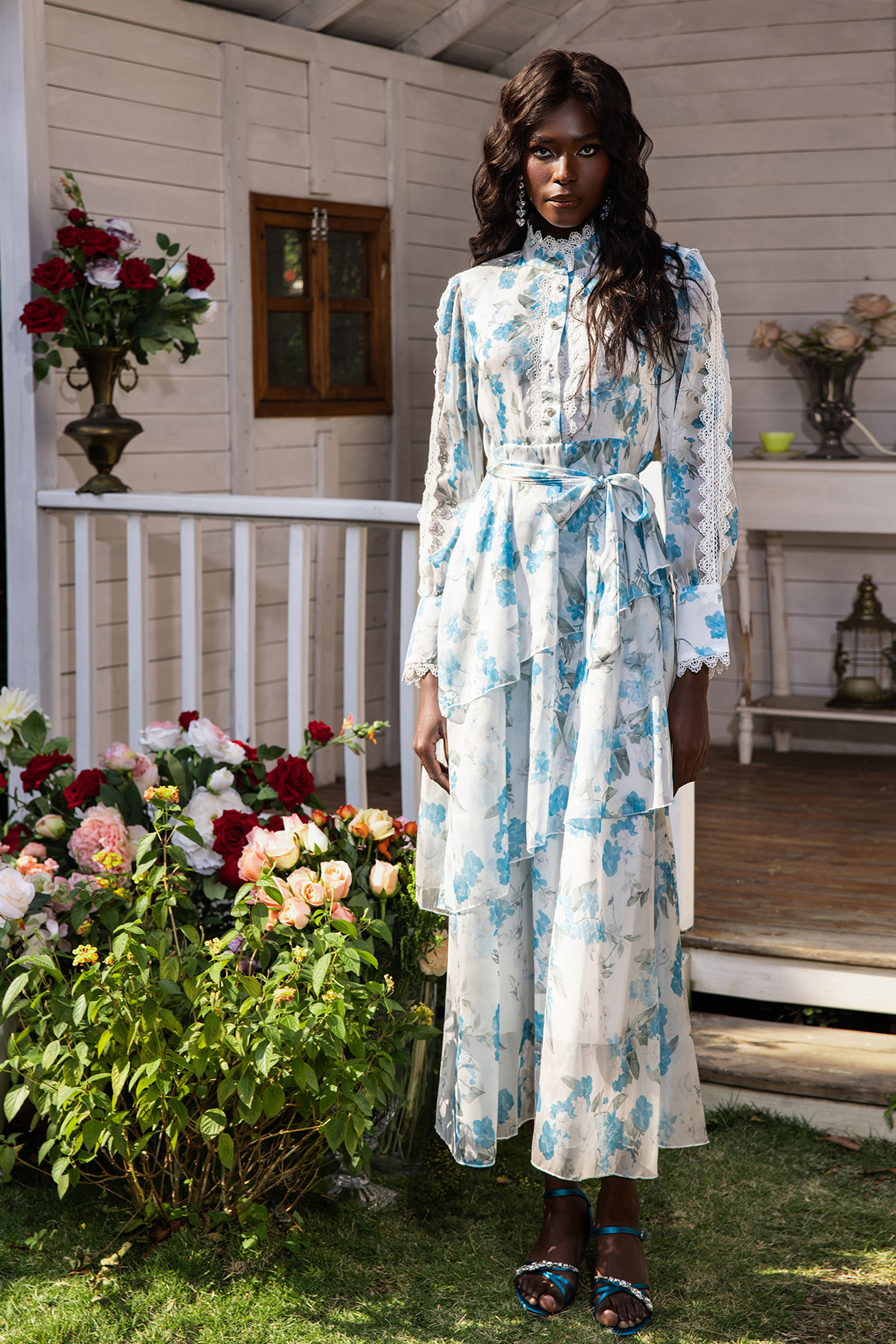 - Long sleeve, lantern sleeve, blue, lace, asymmetrical, floral print, midi dress