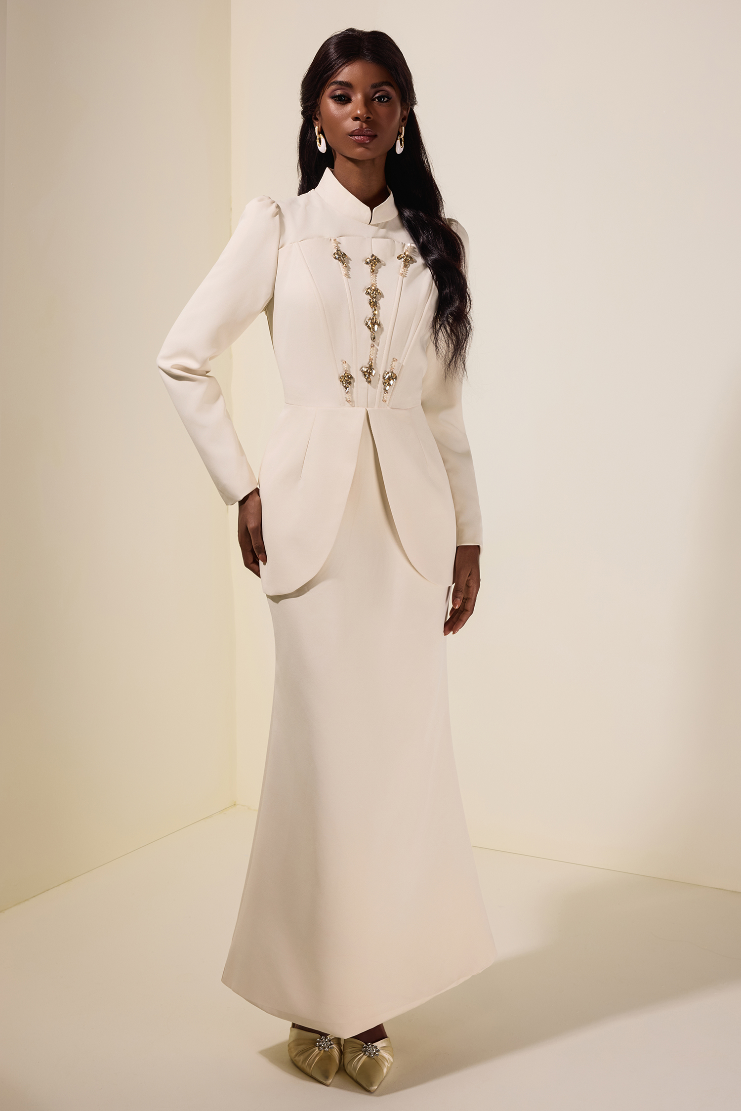 - Long sleeve, solid color, beige, rhinestone, stand collar, maxi dress