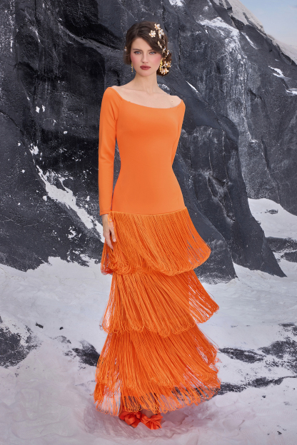 - Long sleeve, off shoulder, tassel, solid color, orange, maxi dress
